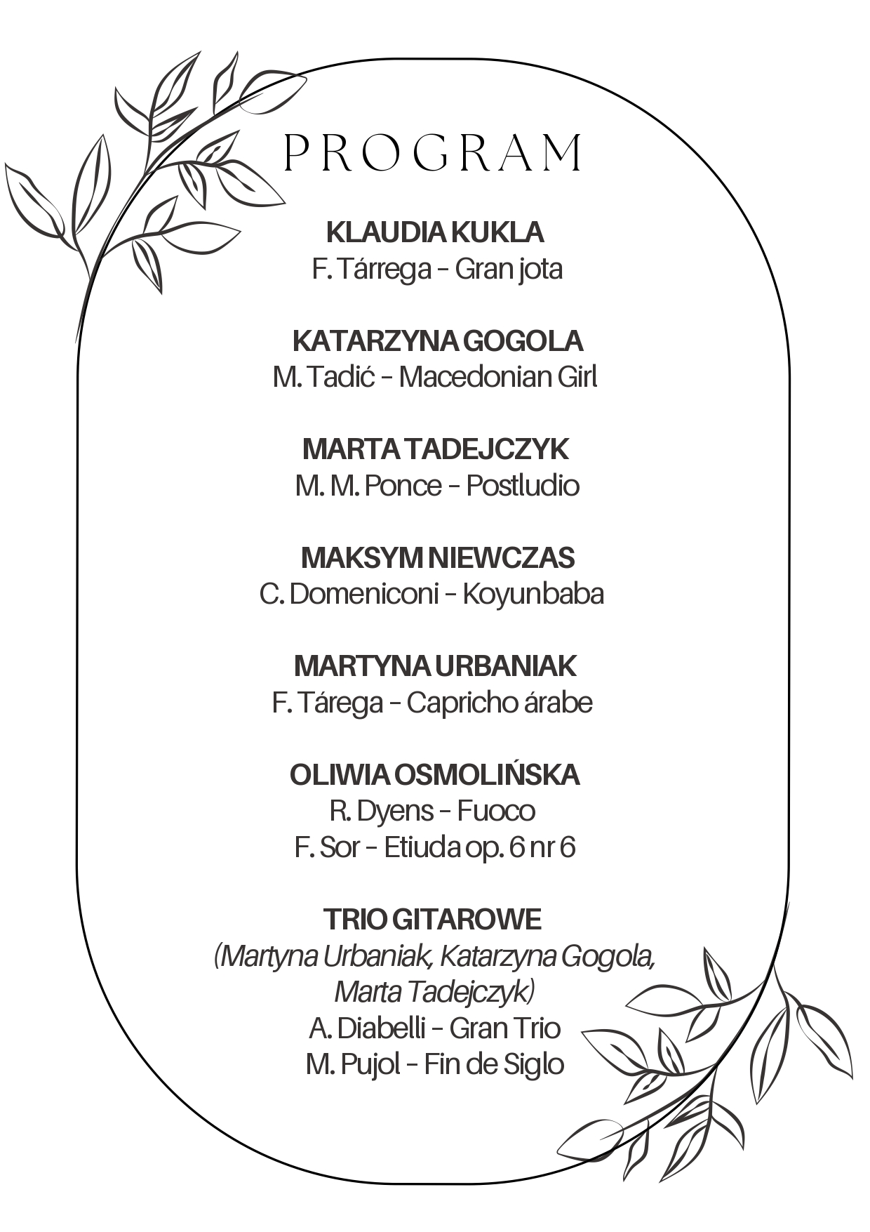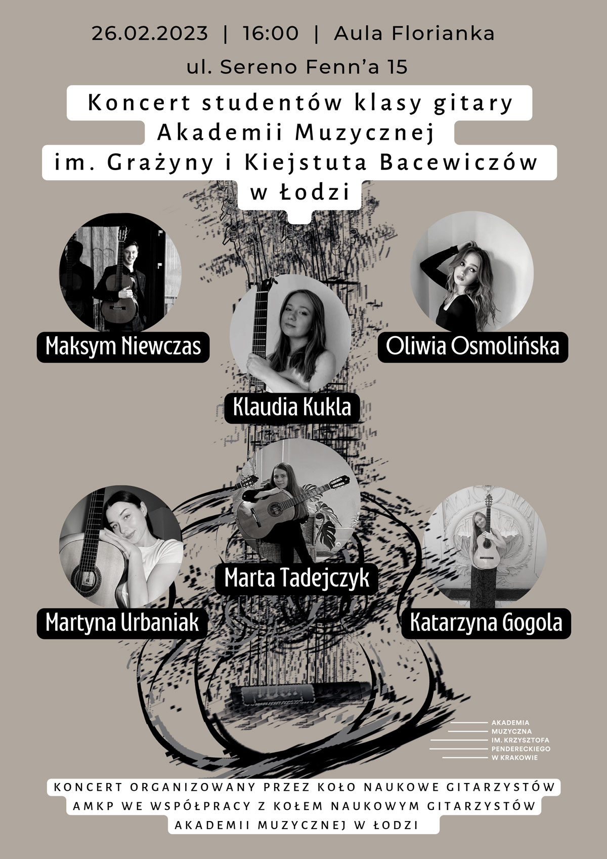 Katedra Gitary i Harfy AMKP zaprasza na Koncert studentów Akademii Muzycznej im. Grażyny i Kiejstuta Bacewiczów w Łodzi do pięknej Auli Florianka, w ramach projektu Międzyuczelnianych koncertów wymiennych organizowanego przez Koło Naukowe Gitarzystów AMKP we współpracy z Kołem Naukowym Gitarzystów Akademii Muzycznej w Łodzi.