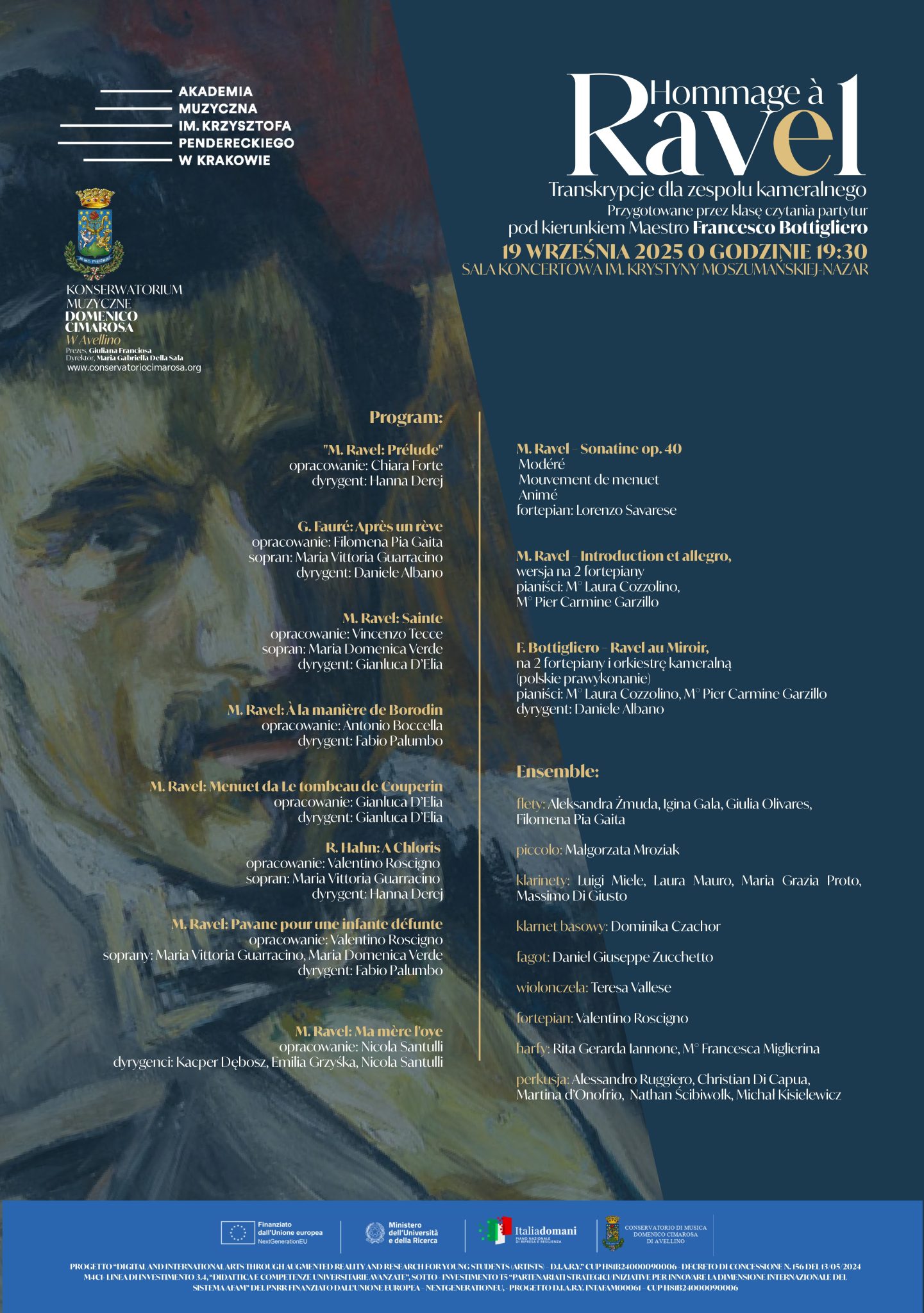 W ramach projektu studenci z klasy czytania partytur z Konserwatorium w Avellino we Włoszech przygotowali pod kierunkiem Maestro Francesco Bottigliero interesujący program koncertowy. Fortepianowe utwory Ravela w ich autorskich opracowaniach na zespół kameralny zabrzmią podczas koncertu finałowego w Akademii Muzycznej im. Krzysztofa Pendereckiego w Krakowie. Wykonają go wspólnie studenci uczelni z Krakowa i Avellino.