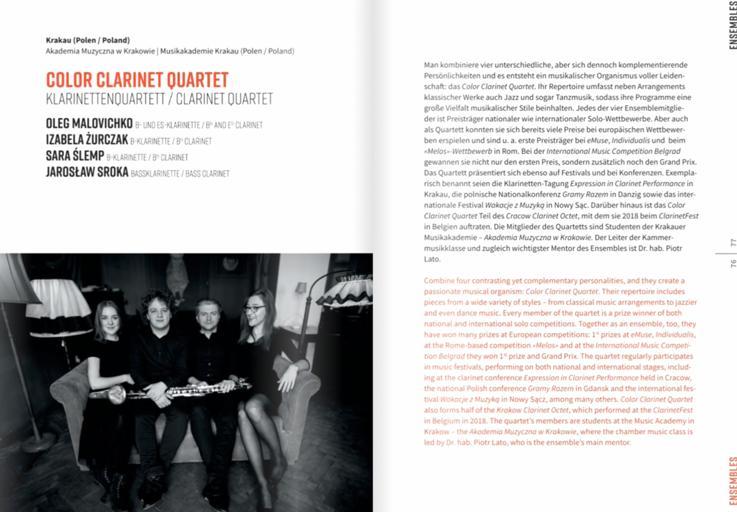 Z inicjatywy dr. hab. Wiesława Suruło, prof. AMKP Katedra Instrumentów Dętych Drewnianych i Akordeonu nawiązała współpracę z Hochschule für Musik und Theater Felix Mendelssohn-Bartholdy Leipzig. Od 2018 roku Akademia Muzyczna w Krakowie (Katedra Instrumentów Dętych Drewnianych i Akordeonu) bierze udział w EKAL – Europäische Kammermusik Akademie Leipzig. W roku 2019 naszą Uczelnię i Katedrę reprezentował kwartet klarnetowy Colors przygotowany przez dr. hab. Piotra Lato, prof. AMKP, w składzie: Oleh Mlovichko, Izabela Żurczak, Sara Ślemp, Jarosław Sroka. Ideą przewodnią projektu było zaprezentowanie dziesięciu grup kameralnych z dziesięciu uczelni muzycznych zrzeszonych w projekcie. W ramach udziału w Europäische Kammermusik Akademie Leipzig, kwartet klarnetowy Colors wykonał trzy koncerty w prestiżowych salach koncertowych, które były spektakularnym sukcesem zespołu oraz naszej Uczelni i Katedry! Współpraca naszej Katedry będzie kontynuowana w roku 2021. W dniach 18-19 września 2021 roku została zaplanowana kolejna edycja Europäische Kammermusik Akademie Leipzig. Bardzo cieszymy się z tej współpracy i czekamy z niecierpliwością na kolejną edycję!!!