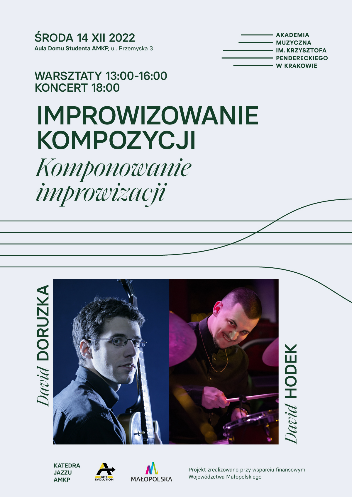 Katedra Jazzu zaprasza na warsztaty z koncertem: Improwizowanie kompozycji. Komponowanie improwizacji. Zaproszonymi artystami będą: David Doruzka – gitara, oraz David Hodek – perkusja.