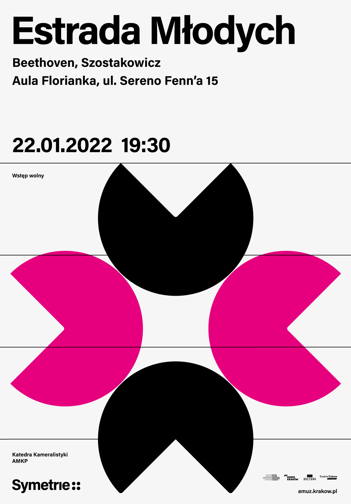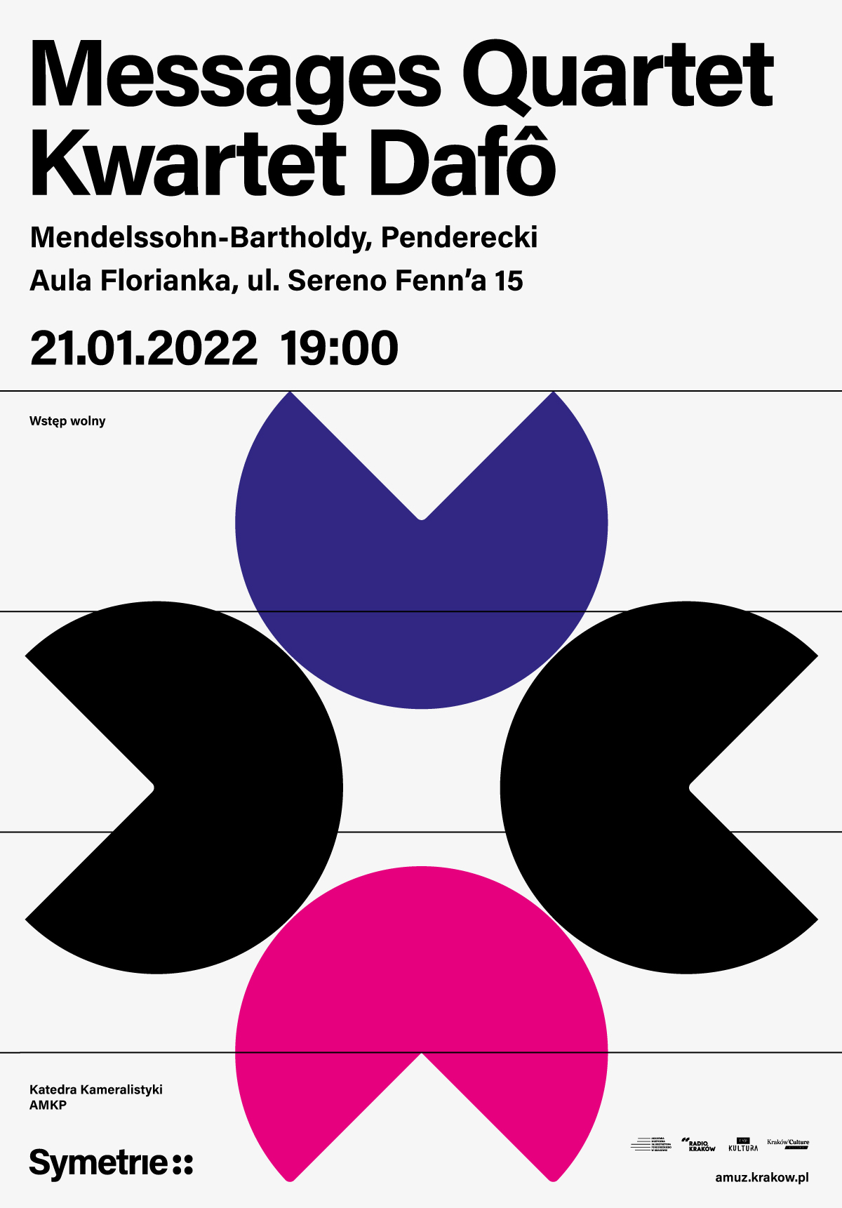W dniach 20-22.01.2022 w Auli Florianka przy ul. Sereno Fenn’a 15 odbędzie się I Festiwal Kwartetów Smyczkowych „Symetrie”, organizowany przez Katedrę Kameralistyki Akademii Muzycznej im. Krzysztofa Pendereckiego w Krakowie.