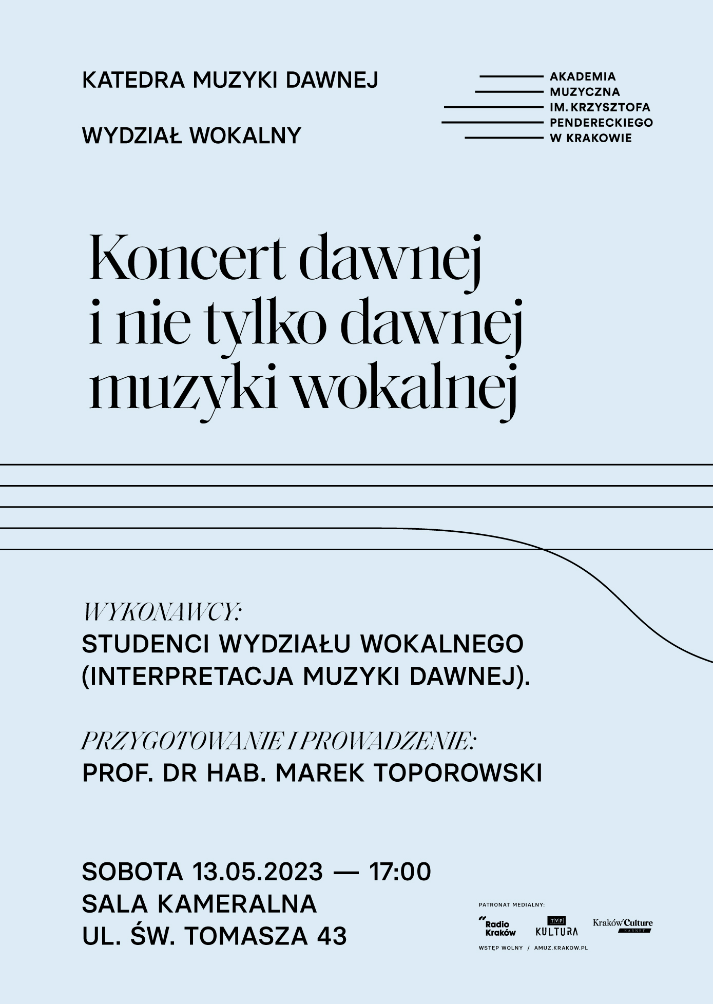 Katedra Muzyki Dawnej wraz z Wydziałem Wokalnym zapraszają na koncert przygotowany przez studentów przedmiotu Interpretacja Muzyki Dawnej.