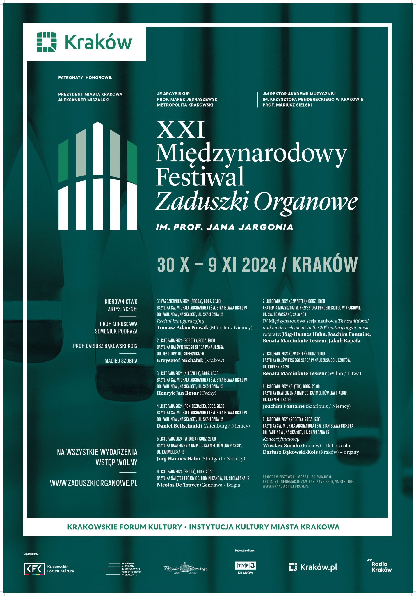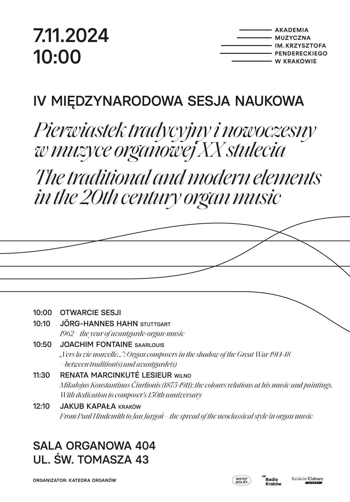 Katedra Organów zaprasza na IV Międzynarodową sesję naukową „Pierwiastek tradycyjny i nowoczesny w muzyce organowej XX stulecia”, projekt partnerski Krakowskiego Forum Kultury, w ramach XXI Międzynarodowego Festiwalu Zaduszki organowe im. prof. Jana Jargonia.