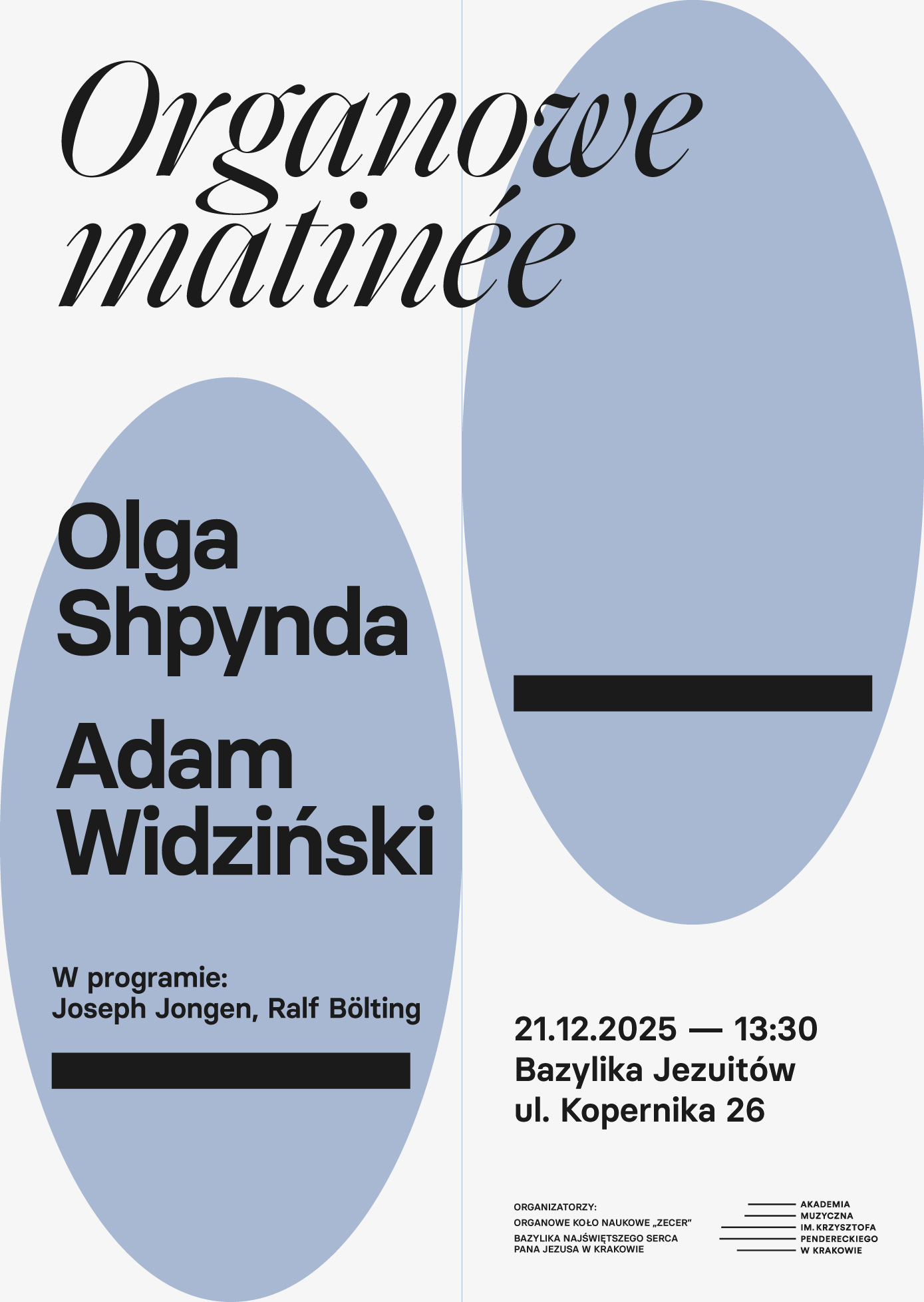 Zapraszamy na Organowe Matinée organizowane przez Bazylikę Ojców Jezuitów w Krakowie oraz Organowe Koło Naukowe „Zecer” działające przy Katedrze Organów w Akademii Muzycznej im. Krzysztofa Pendereckiego w Krakowie. Koncert odbędzie się 21.12.2025 roku o godz. 13:30 w Bazylice OO. Jezuitów przy ul. Kopernika 26.