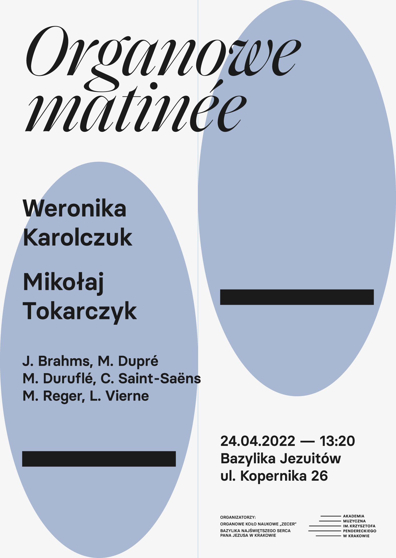 Wykonają je Weronika Karolczuk i Mikołaj Tokarczyk – studenci AMKP. Koncert odbędzie się 24.04.2022 godz. 13:20 (po Mszy Świętej o godz. 12:30) w Bazylice Najświętszego Serca Pana Jezusa OO. Jezuitów w Krakowie, ul. Kopernika 26.