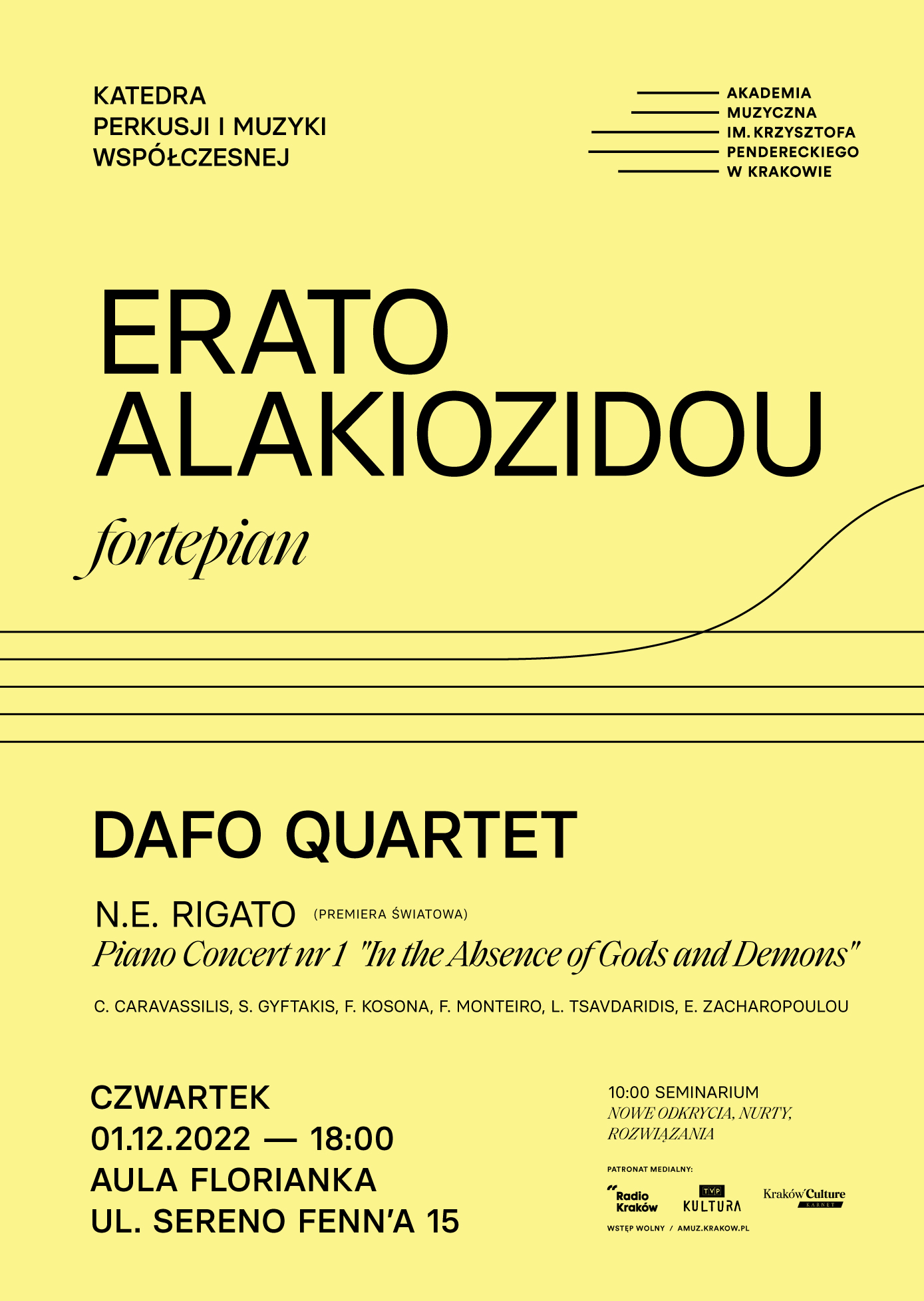 Tematem seminarium będzie prezentacja liryczności i ekspresji muzyki współczesnej na przykładzie m.in. kompozycji Nicoli Eliasa Rigato w Piano Concerto Nr 1 „In the Absence of Gods and Demonts”, skomponowanej w 2022 roku dla greckiej pisanistki Erato Alakiozidou oraz Kwartetu DAFō. Utwór wyróżnia się ciągłą dychotomią między światłem a ciemnością w naprzemiennie występującymi muzycznymi elementami kontrastu. Nieustająca próba chronienia piękna otoczonego gorzkimi dysonansami i dźwiękowymi dezorientacjami jest przedstawiona w ulotnych dźwiękach fortepianu wtapiających się w klimat muzyki kameralnej. Prawykonanie „In the Absence of Gods and Demons” odbędzie się 1.12.2022 w Auli „Florianka” o godzinie 18.00.