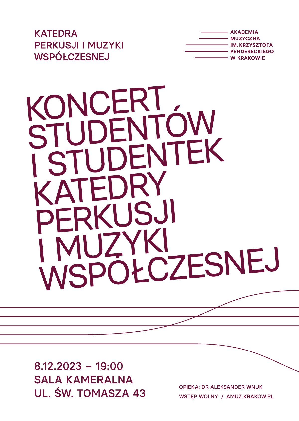 W programie literatura solowa i kameralna z aktualnego repertuaru adeptów perkusji i zespołów kameralnych prowadzonych w ramach przedmiotu Praktyka Wykonawcza Muzyki Współczesnej.