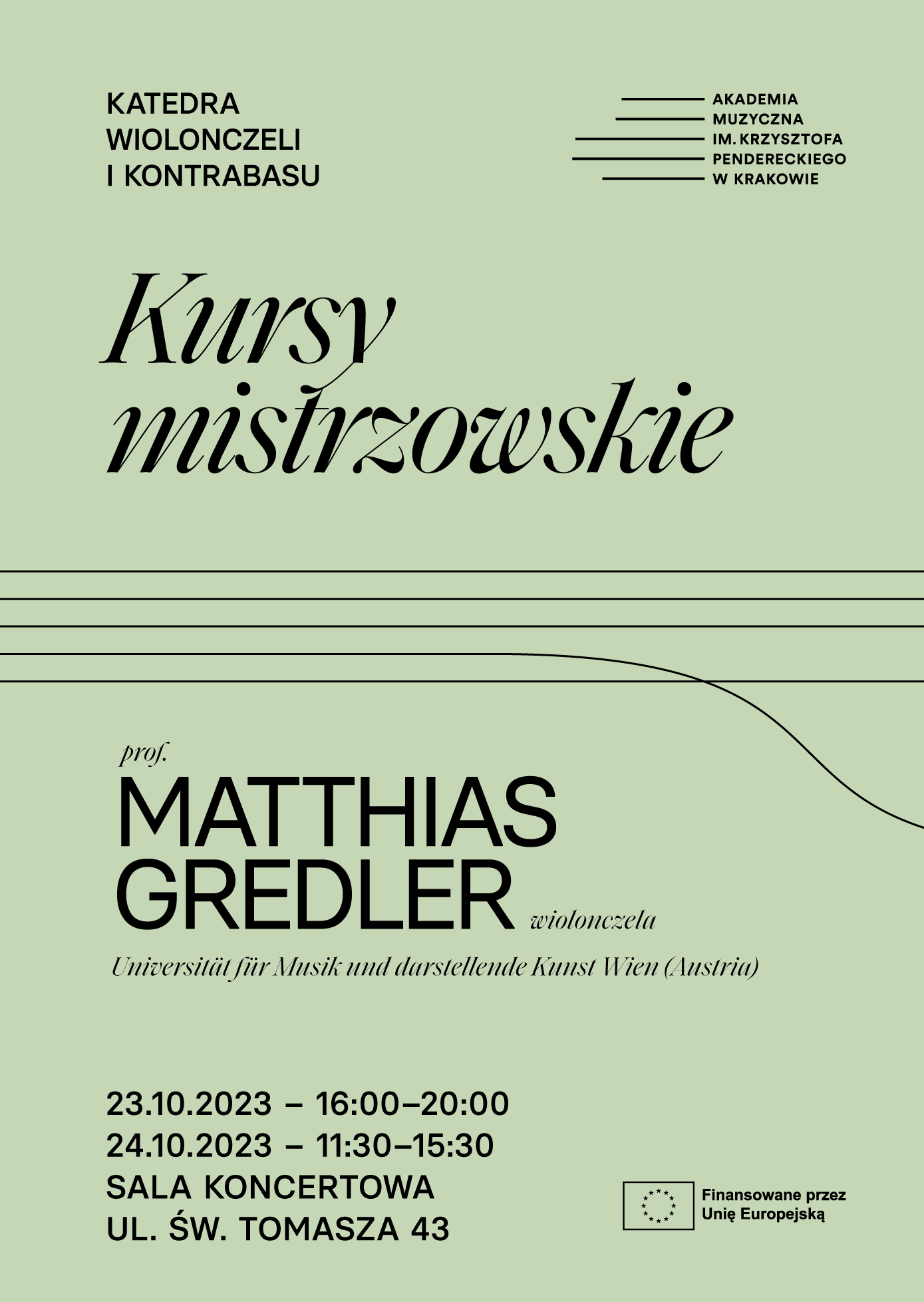 Katedra Wiolonczeli i Kontrabasu zaprasza studentów i studentki na lekcje mistrzowskie z prof. Matthiasem Gredlerem z Universität für Musik und darstellende Kunst Wien (Austria).
