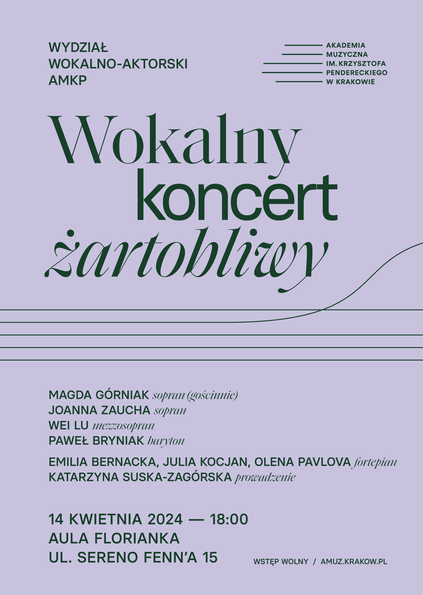 Koncert studentów klasy śpiewu solowego prof. dr hab. Katarzyny Oleś-Blachy | 20.05.2024 G.F. Händel “Xerxes” | 8-9.05.2024 Krakowskie Historie Muzyczne. Kraków Muzyką Malowany | 18.04.2024 GA-LA-LA-LA – performance by students of the AMKP Faculty of Voice and Drama in the Krakow Opera | 24.02.2024 Giacomo Puccini – “Il bel sogno” – koncert w 165. rocznicę urodzin kompozytora | 11.12.2023 Wokalny Koncert Żartobliwy | 14.04.2024 Sorry, this entry is only available in Polski.