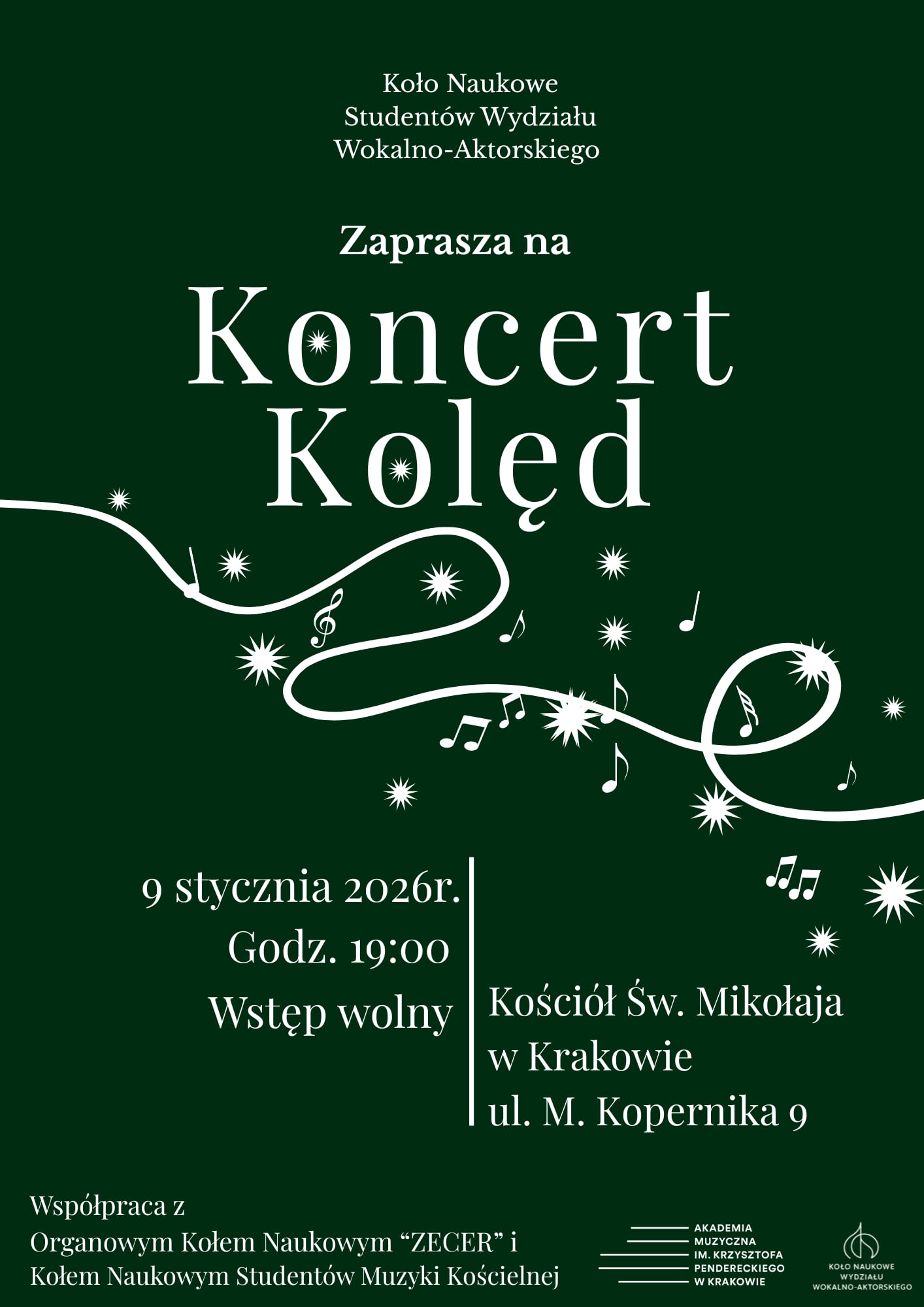 Koło Naukowe Studentów Wydziału Wokalno-Aktorskiego zaprasza na wyjątkowy Koncert Kolęd, który odbędzie się 9 stycznia 2026 roku o godzinie 19:00 w Kościele św. Mikołaja w Krakowie przy ul. Mikołaja Kopernika 9.