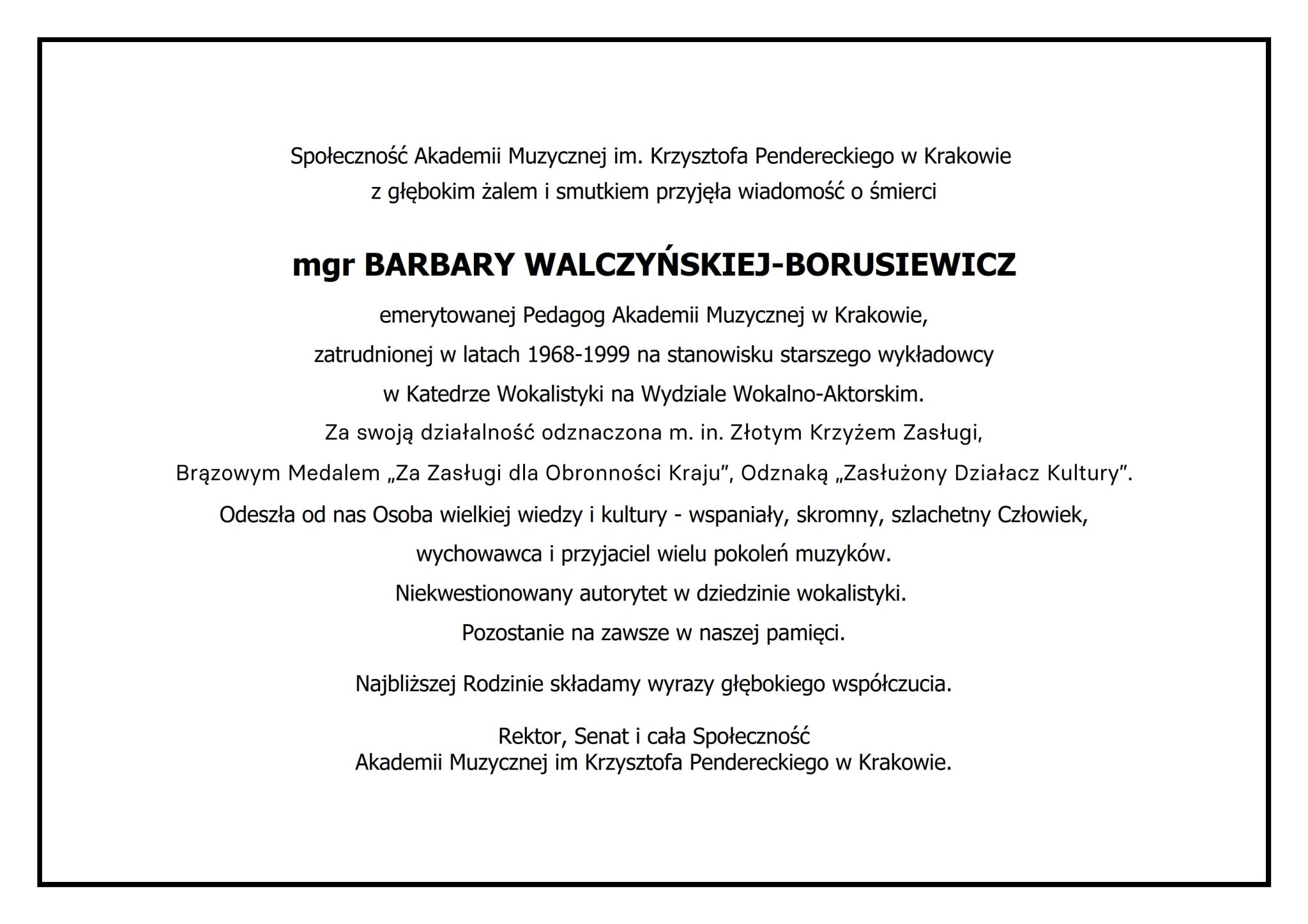 Społeczność Akademii Muzycznej im. Krzysztofa Pendereckiego w Krakowie z głębokim żalem i smutkiem przyjęła wiadomość o śmierci